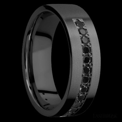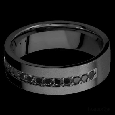 7 mm wide/Flat/Zirconium band with a Half Eternity arrangement of .03 carat Round Black Diamond stones in a Bead setting.